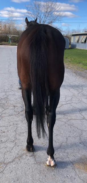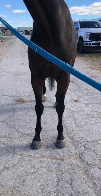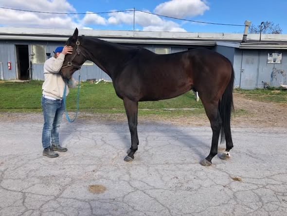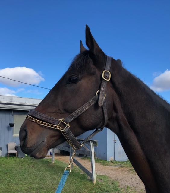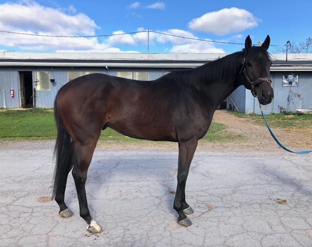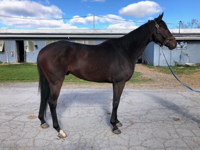 This “cool dude” has only been with his current connections for only a few months, but they told us that he has been very enjoyable to be around and that he “is the perfect horse to train” because he “makes it easy”. He’s described as being very mature for his age (only five!) and that he has an “old soul”. We observed a perfect gentleman who was quiet, polite, curious, and sensible. His trainer told us that he is good in his stall without any vices, clean-legged, and sound, without any issues. American Day has an extremely kind, intelligent, and gorgeous face. We felt his legs and found them to be clean, cold and tight. He’s campaigned hard this past year, so his trainer thinks that he will be gorgeous once he gets a chance to have a little downtime to fill out. And we totally agree! American Day is described as being more of a turf horse and “not a dirt guy”. He’s described by his trainer (who gallops his own horses) as being a nicely forward to ride with tons of stamina. Sounds like a potential cross-country machine to us! During his video, we saw a relaxed, swinging walk and he jogged along on a looser lead with reach and push from behind. Although he’s had a respectable race resume, he has yet to score his first win so his connections feel that it is now time to move him along on to his second career. We think, given his endurance, this turf-loving boy could have a bright and happy future as an eventer or perhaps a field hunter. American Day is by New Year’s Day and out of a Dixie Union mare (with Dixie Union on his sire’s side as well).