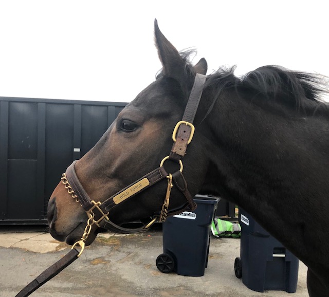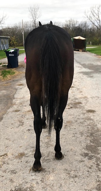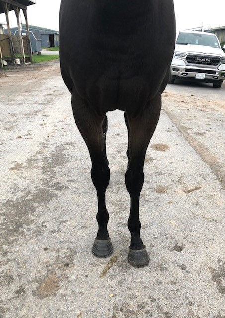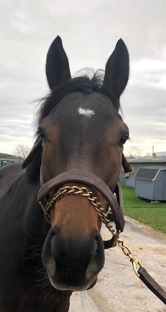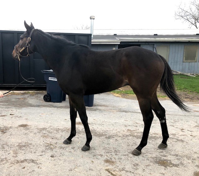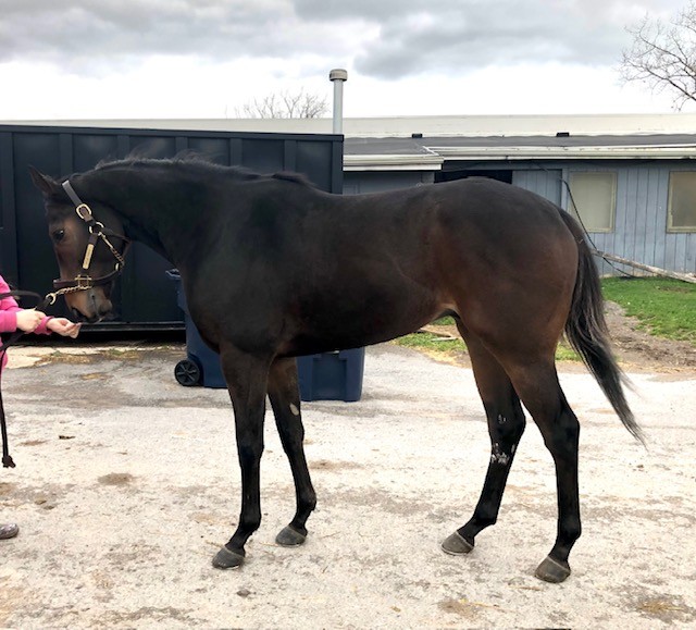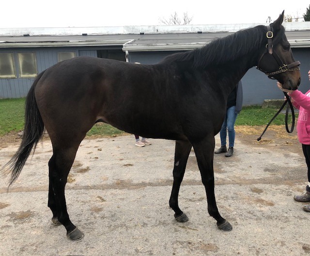 If you are looking for a young horse with exceptional potential for jumping disciplines, then you should give serious consideration to this handsome guy. Since he is only three, he is likely to grow a bit more. His dam is a sister to the horse who won the show hunter division at the 2023 RRP, and placed very high in the jumpers as well, displaying a beautiful scopey jump. The jumping genes are certainly there for Bold Force! With his pretty elegant head, compact build, strong sloping shoulder, quiet temperament, and very nice movement, we think he could fit right into the show hunter ring, but he also has unlimited potential for any discipline. Bold Force’s handler described him as a good boy, nice to handle, with no vices. His trainer said he is sound and hasn’t had any issues — he just isn’t racing well in tougher competition since he broke his maiden, so it is time to let him find a new career. He has 11 career races, with one win, but no wins this year. Bold Force was very friendly for his photo shoot, nuzzling our volunteer in the hope that her camera might be a treat for him! He jogged politely on a loose lead, with a nice swinging walk and an even balanced trot with good hind end engagement and nice flat kneed reach from the shoulders. He is sired by Hard Spun, who is a son of Danzig. His dam is by Scat Daddy out of a Meadowlake mare who not only produced the RRP winner, but also produced some graded stakes winners. We would love to see him in the RRP next year to find out if he can emulate the success of his close relative! This is a quality young gelding offered at a bargain price!