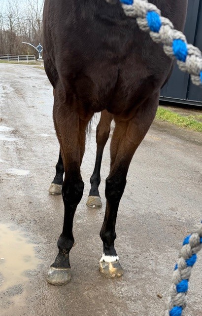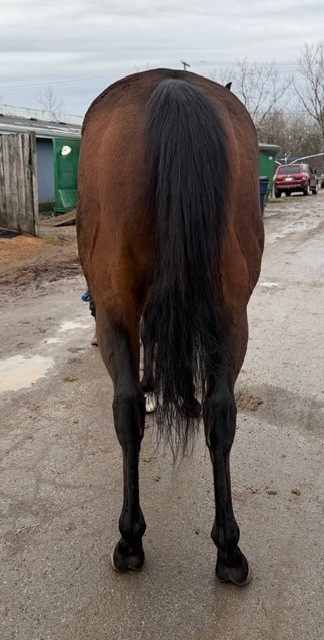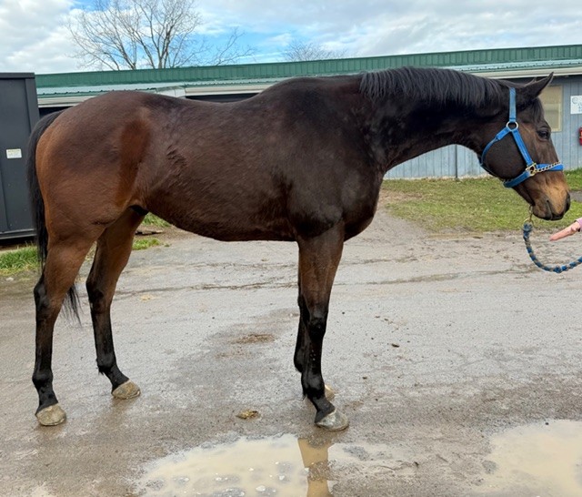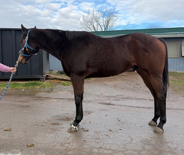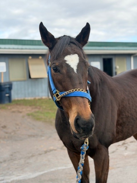 Naturally, he stood politely for his photos. We like his build with a nice, wide chest. He has a cute heart-shaped marking on his face; his connections say you can always clearly see it is him as he’s running down the stretch. He’s does have some rounding on his ankles, but we were told that they’ve never bothered him. He generally has no bad habits or vices other than he is a stall walker, and this occurs at both the track and the farm. But he’s great in turnout- alone or with another horse. Given this, we suspect that he may be happiest if he could be in a 24/7 turnout situation.