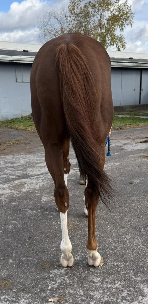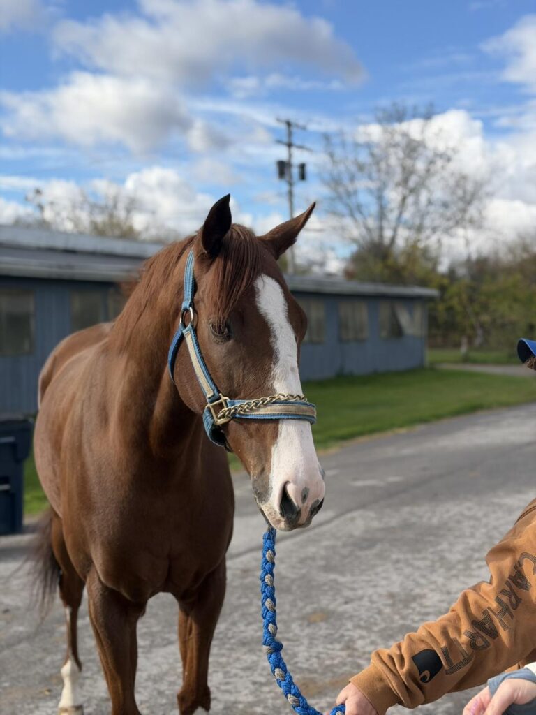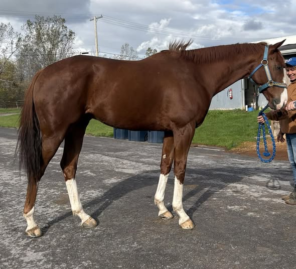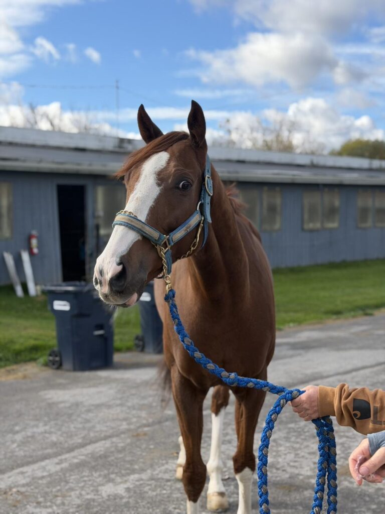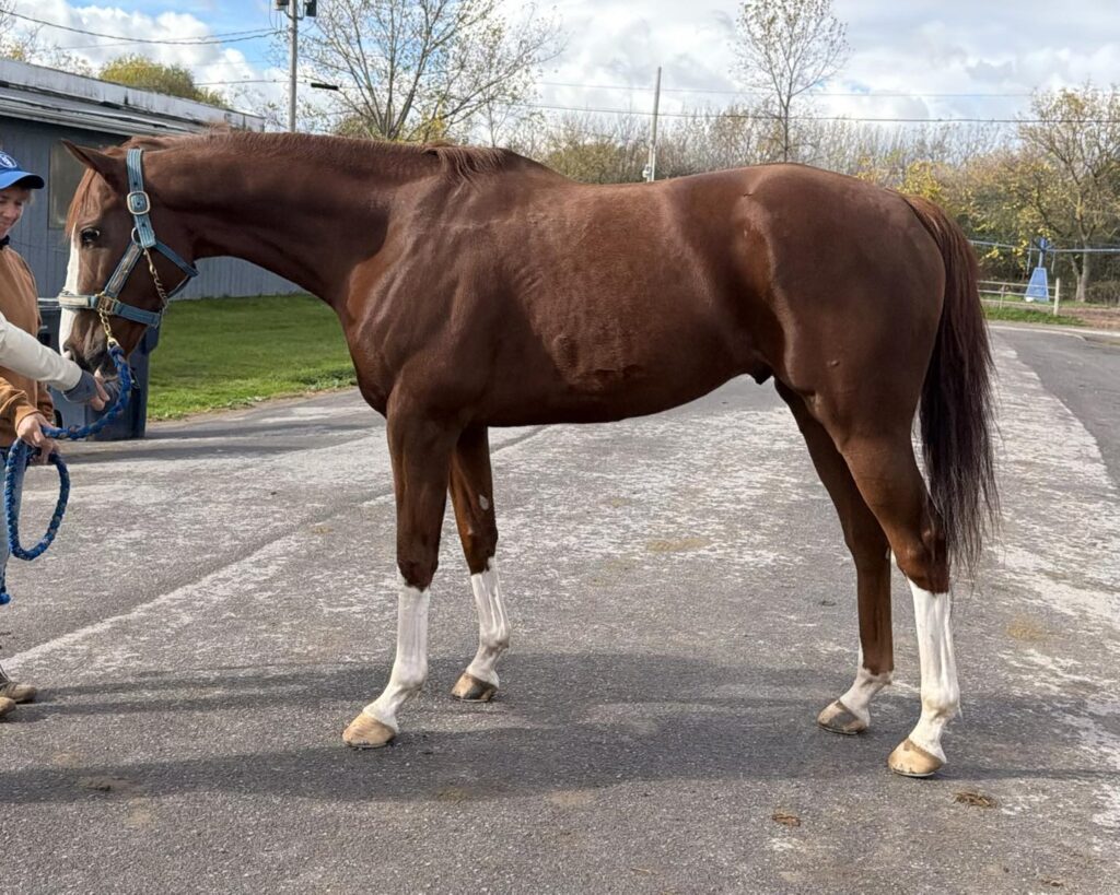 Bustin Pietre is applying for the title of Mr. Personality! This barn favorite is full of red head sass, but never in a mean way, just in a “please notice me way”, and how can you miss a guy this good looking! According to his connections, Pietre’s only vice is that at the track, he weaves ever so slightly, but he does not do it at the farm. He is otherwise easy to work around and is fantastic at the farm and in turn out.