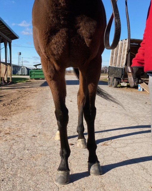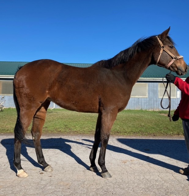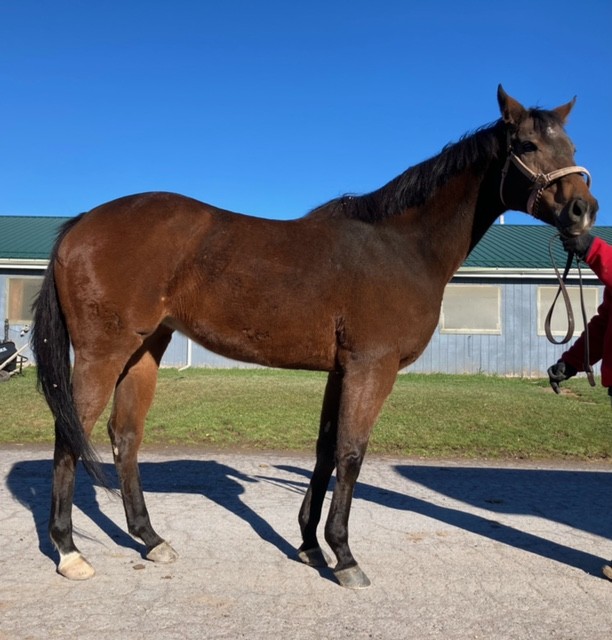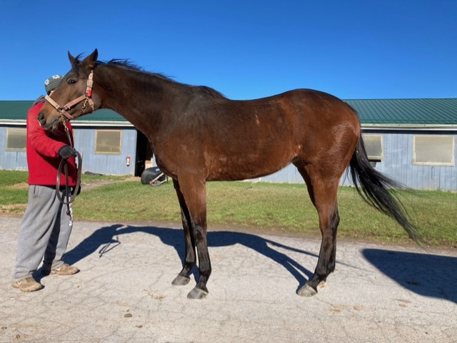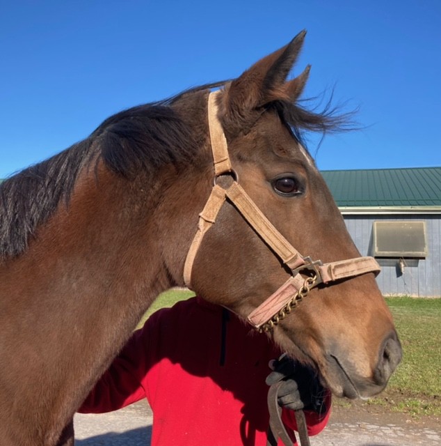Comfortable Cat has been a good consistent successful racehorse, accumulating 8 wins, 26 top three finishes, and earnings of $173,000 in her career. And her trainer says she is still as sound as they come, and she is lovely light mover! Surely this girl deserves a great new home, where she will give her new person as much as she has given to her racing connections over the years. Those of you who overlook her just because she’s not huge and not a silly youngster will come to regret it. Her trainer kept saying “this is one nice little mare!” as he extolled how good she is to handle, what a big heart she has, how she “does everything right” — loads easily, stands politely for the farrier, is good to ride and does whatever her rider asks. We admired her pretty head, alert kind eye, clean legs, and balanced compact build. For her video she displayed a big swinging walk and a lovely light and even toe flicking trot. As we watched her trot we were hardly surprised that she is a light and efficient mover, because horses who have been this durable and sound over a multi-year racing career are usually very good and efficient movers. She has an exceptional pedigree for jumping aptitude. Her sire Discreet Cat has sired several horses that we have placed over the years, and they all turned out to be exceptional jumpers. Her dam is by Dixie Union, who is by Dixieland Band, and is out of a Seattle Slew mare. With her racing success and her pedigree, Comfortable Cat is also a good candidate for a broodmare career, either for racing or for sport horses. Please open your heart to this beautiful deserving mare!