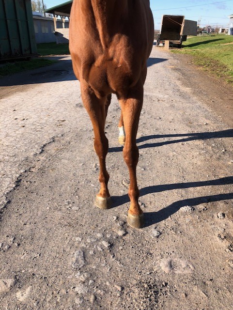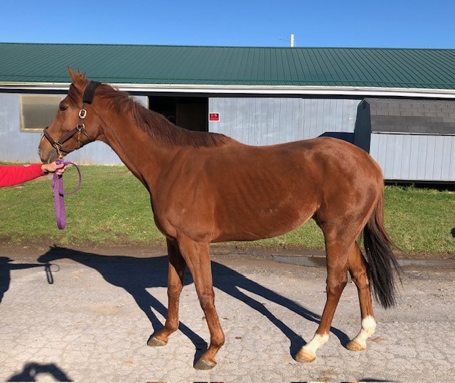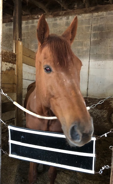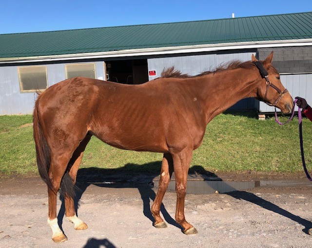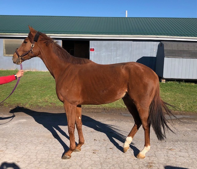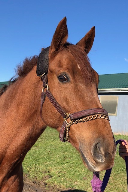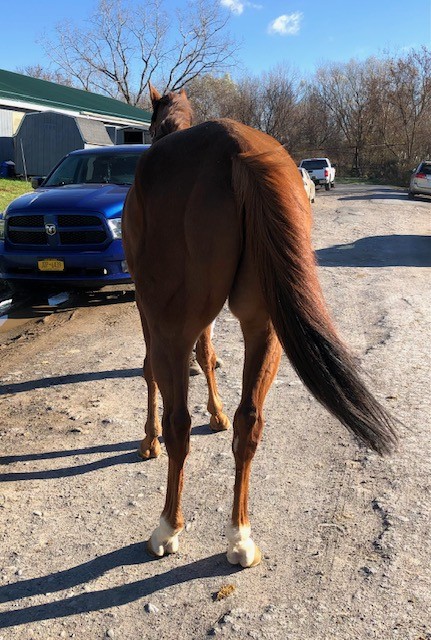 This kind wise soul has been a well traveled, successful hard knocking race horse who is so deserving of a great new home. He has 8 wins in his career with over $219,000 in earnings, and has raced all over the country — NY, California, Texas, Pennsylvania. This year his racing performance has tailed off, and he is telling his connections it is time to let him move on to a new career. He came to his current trainer earlier this fall, and she reports that throughout his successful career he has never had any injuries, that he is a good boy who is easy to handle, good for farrier, good to load, — good for everything she says! She gallops her own horses and she also praised Horn of Plenty as very good to ride, easy to gallop, a professional who does just what you want. She says that in his many travels for his racing career he hasn’t had a real break to just enjoy being a horse, and that he would benefit from, and greatly appreciate the opportunity to enjoy turnout and let down time. And then he will show you his big heart and hard trying durability for whatever new direction you want to take him in. He has sold bone, clean legs, a very kind eye, and a kind temperament. For his video he walked and jogged politely, showing a nice swinging walk and an even light trot with a nice hint of spring. Horn of Plenty is sired by Emcee, a son of Unbridled’s Song. Over the past several years we have placed several Emcee offspring who are now doing well in new careers ranging from eventing to dressage to pleasure riding. Horn of Plenty’s dam is by Lemon Drop Kid, a sire who has produced many successful eventing horses, jumpers, and hunters. Wouldn’t you like to be the person who takes Horn of Plenty on the next chapter of success in his new career?