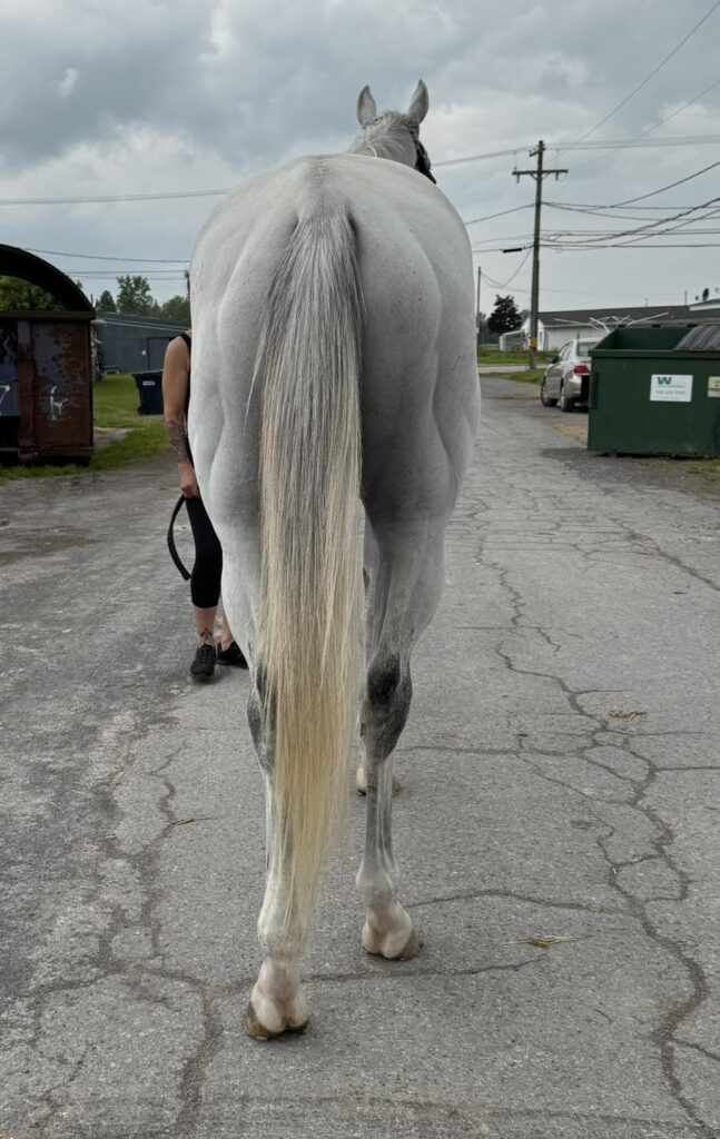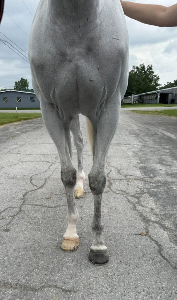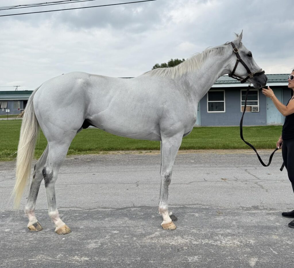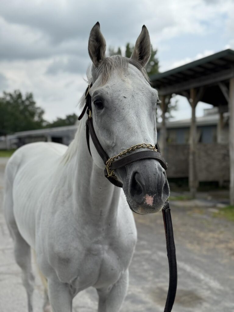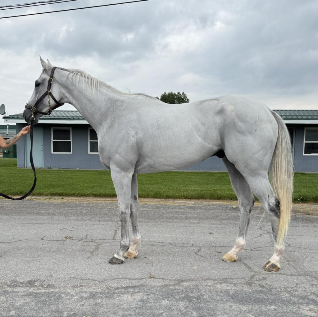 Attention grey lovers- In the Blue is not only a coveted grey, but also sweet, levelheaded, and an all-around easy-going guy! His handler ponies him for his races and she reported that he is very good to pony, easy, and knows his job. He is reported to have no vices in his stall and easy to work around, though at the track, he can sometimes offer a grumpy face. He is all bark though, and no bite. He is straightforward to ride and doesn’t offer any funny business. He is reported to be sound with no previous injuries.