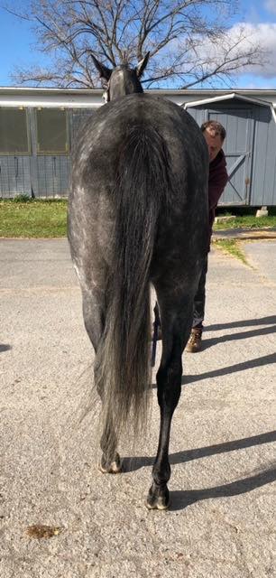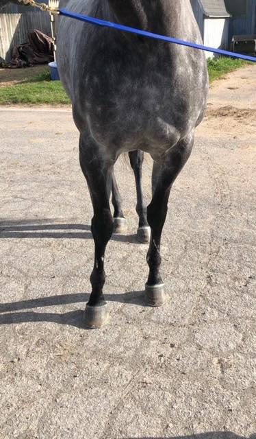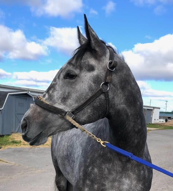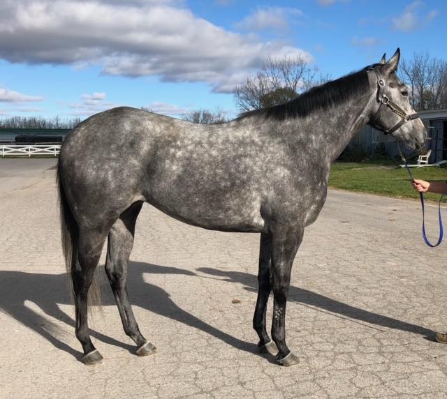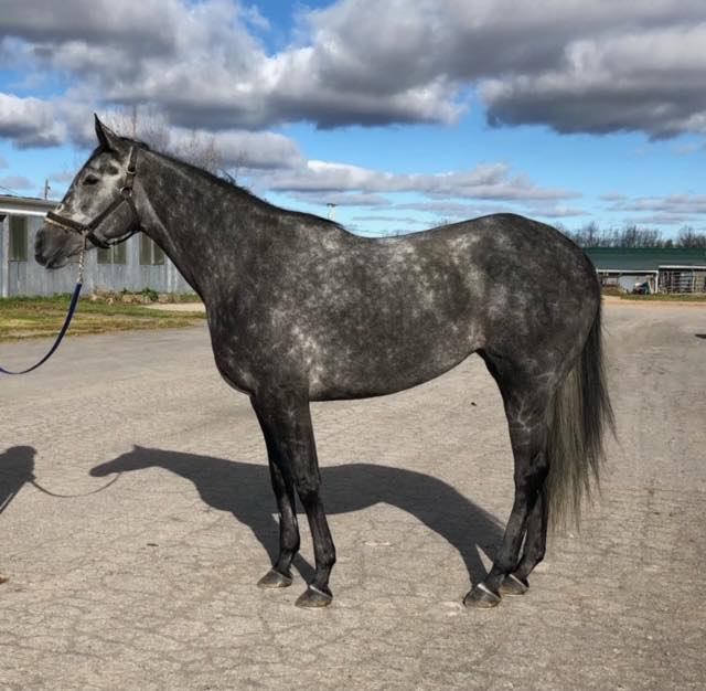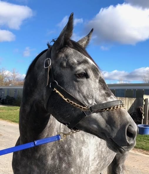 We first observed this homebred mare in her stall where we saw her being sweet and affectionate with her trainer. We’re told that she loves to be fussed over- and one of our volunteers discovered this for herself as she received some Last Best Laugh nuzzles making it very clear how much she enjoyed being scratched on her neck, shoulders, and withers. This girl would certainly enjoy being pampered with spa days and appreciate regular massages! She was a proper lady for her photo shoot- quiet and polite. She is compactly built, and is one “big, solid, strong filly”. She has great width through both her chest and haunches, giving the impression of an extremely powerful girl who might be able to generate quick bursts of speed. We were told that she had a RF splint and has the leftover freeze fire marks, but it is from almost two years ago and is currently cosmetic only. We were told that she can be strong and forward to ride and as such, that she might be best for an experienced OTTB handler. Her trainer told us that he “breeds for endurance” and this mare’s lineage would suggest that she might have the pedigree chops to perform well in either the eventing or show jumping arenas- she’s by Creative Cause, a son of Giant’s Causeway and out of an Elusive Quality mare. But given her build, strength, balance, and confident attitude- we wonder if she might be a consideration for some western disciplines as well- perhaps working ranch? She’d certainly look adorable in western tack! Like her former stablemate Fluorescent Bay (who is also listed by FLF this week), her early race career was delayed when the training center she was first sent to as a 2-year-old did not provide the satisfactory foundation to her racing career that her trainer was looking for. Now, with only two lackluster starts on her racing resume, it looks like she may have missed her chance to be a serious race horse but that’s okay because it means that she is basically a blank canvas for you!
