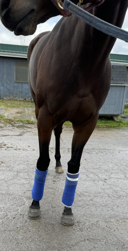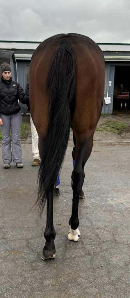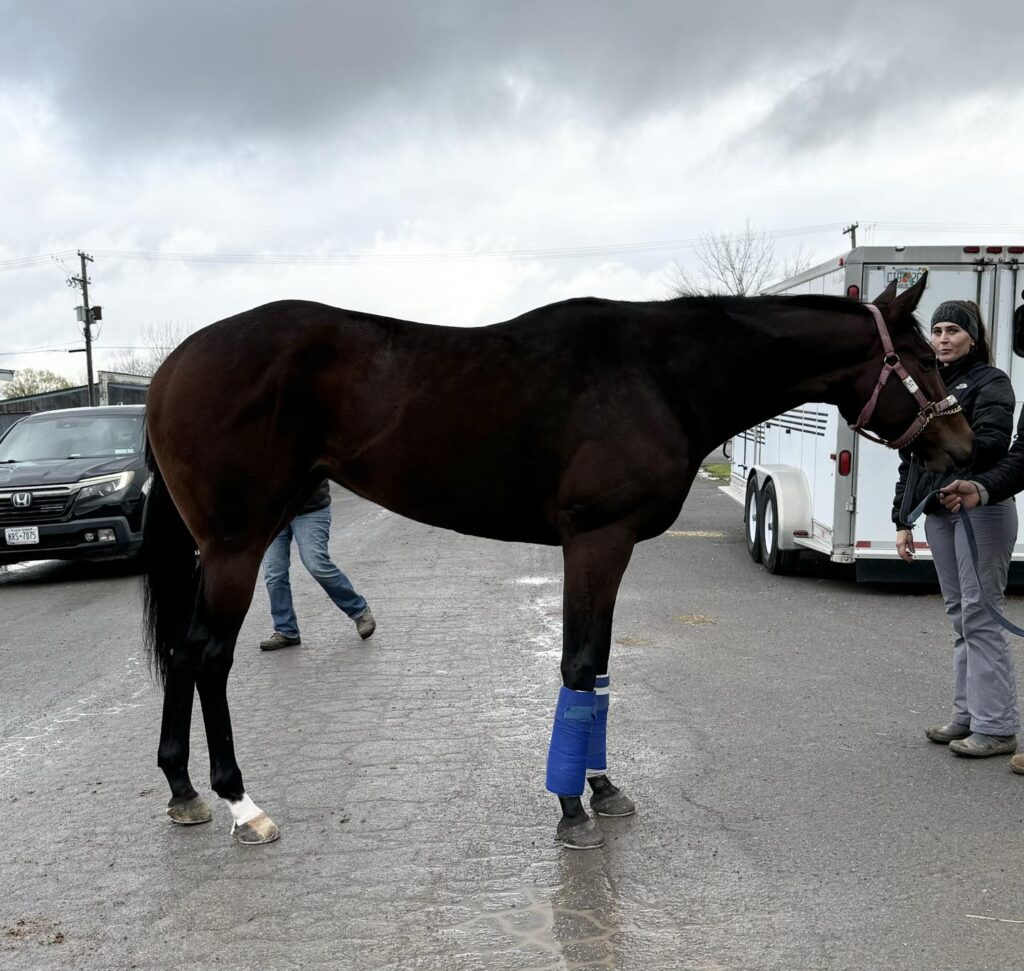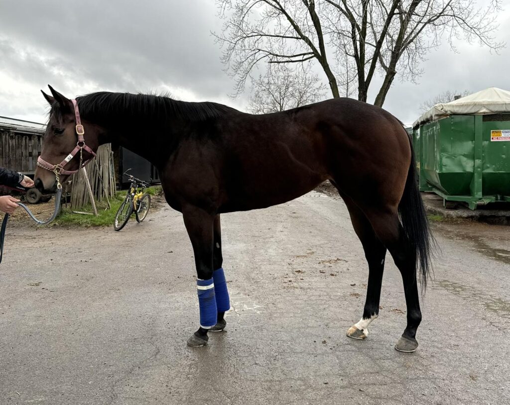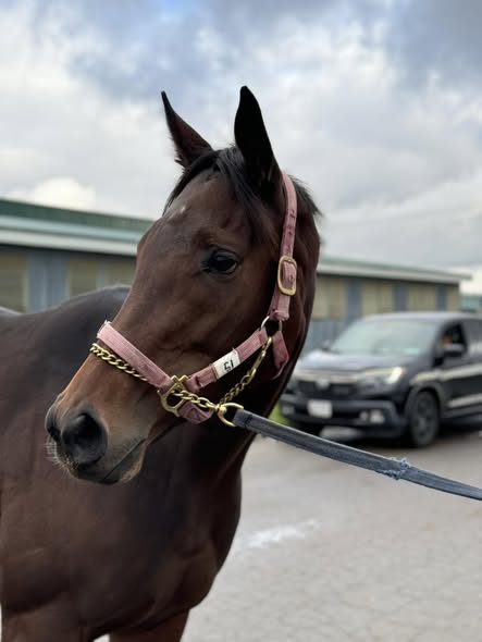 Like a good leader, Leadership Ability exudes a quiet, patient confidence. And why shouldn’t she? This dark, gorgeous filly by Laoban has previously sold at auction for $175K. So she should know she’s good! And she is perfectly lovely, cute, athletic, and refined. We loved her kind eye and pretty, very feminine face. She has a great build with a nice long shoulder and correct proportions. She looks solid and powerful. We were told that she is sound without any vices. We observed a classy, super sweet, and sensible girl during our photo shoot. Even though it was chilly and windy, she calmly stood as we admired her and got her history. She jogged politely and displayed a pretty, springy, lofty, toe-pointing trot giving the feel of a light, airy uphill front end. We liked her balance. This pretty girl is a clean slate without any limitations and we could see her having the ability to excel in a variety of disciplines. She is a nicely bred girl- by Laoban, out of a Best Reward mare. Leadership Ability broke her maiden at Saratoga and has had a respectable race record with three wins to her credit. She has an entry at Finger Lakes on 11/27 if you’d like to watch her run before you take her home!
