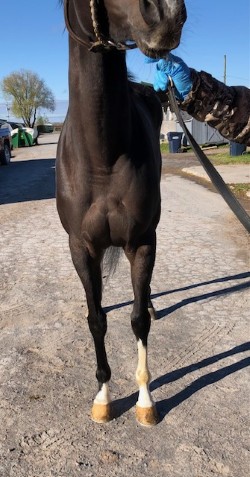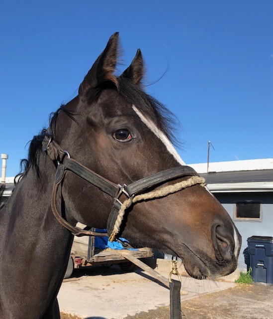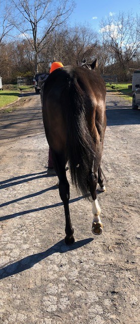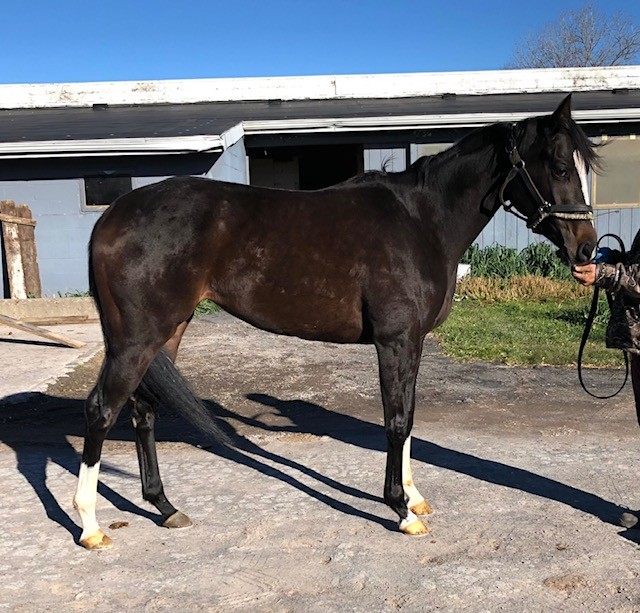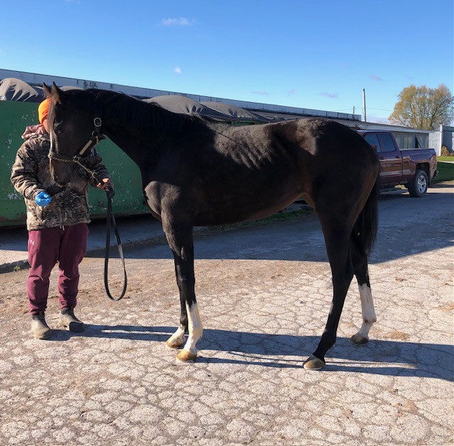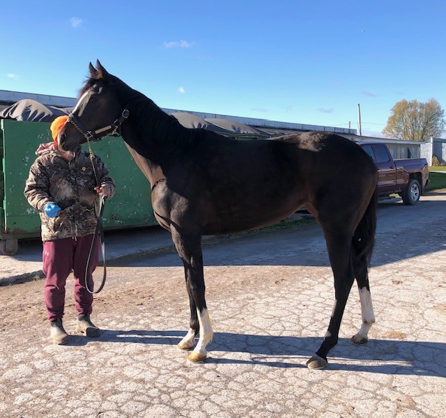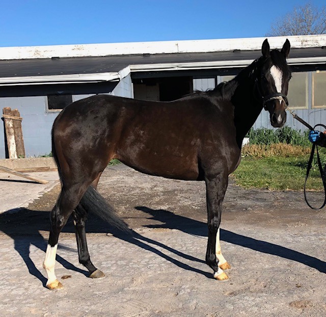 This flashy young filly with lots of chrome is described by her trainer as a good girl who is easy to handle, sound, good in her stall, with no vices, but just not proving to be fast enough to continue on with her in racing. She broke her maiden earlier this year, and since that lone win she has found the tougher racing conditions against other winners more challenging. Miami Chrome was very well behaved for her photo session on a cold windy day that had many other horses we saw acting up in the cold wind gusts — but not this lovely girl. For her jog video she displayed higher kneed movement and a strong hind end engagement that should transfer will to dressage and related disciplines. Given her smaller stature, build, and good push from behind we could also see her excelling as a barrel racer or in polo. She is sired by Disco Partner, and was his first winner! Disco Partner was a top turf sprinter who won over a million on the track racing against the best of the best. We think he has transferred his heart and try and athleticism on to his lovely daughter. Disco Partner is from the desirable Dixieland Band sire line. Miami Twofer’s dam is by Archarcharch from the very desirable ammy friendly sport horse sire line of Arch, and with the Saint Ballado/Halo sire lines on her dam side. This pedigree suggests a good work ethic, athleticism, and durability. Miami Twofer can go in any direction you want — she has no limitations for a new career.