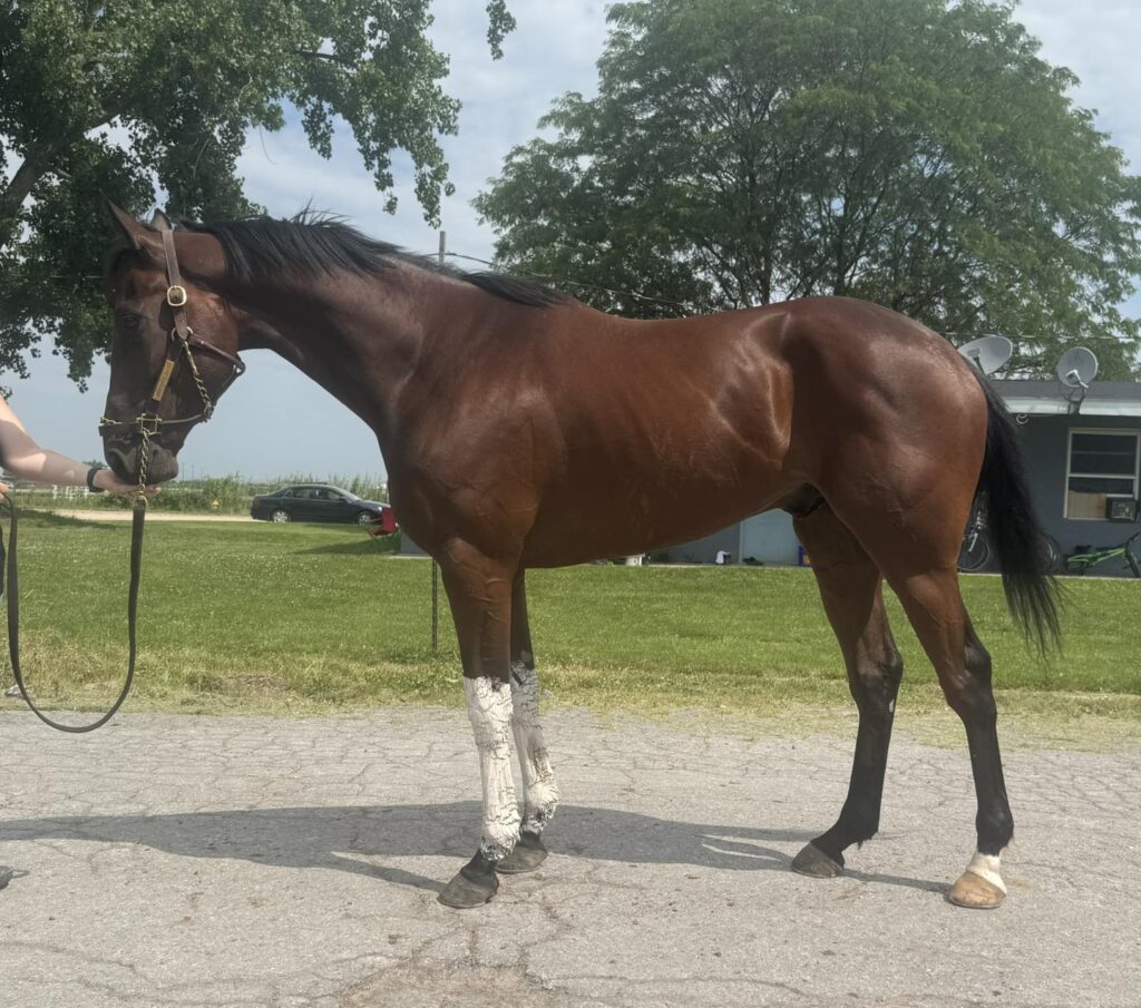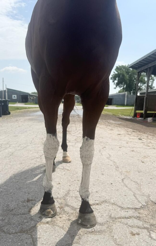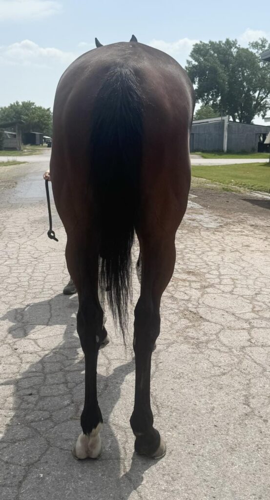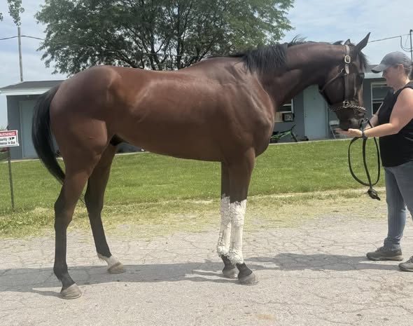 Mortgage Rate is reported to be sound and to have no previous injuries. He has poultice on his legs as he was ready to race the next day. After a successful year last year, with 4 wins, he just isn’t showing any interest in racing. He posed like a champion for his photo shoot, and didn’t even mind while his trainer’s daughters moved legs and head (and teased each other) to be sure he was set up just right. For his video, he demonstrated a natural over track at the walk. He showed off a flat-kneed, toe-pointy jog, despite feeling lazy from the heat.