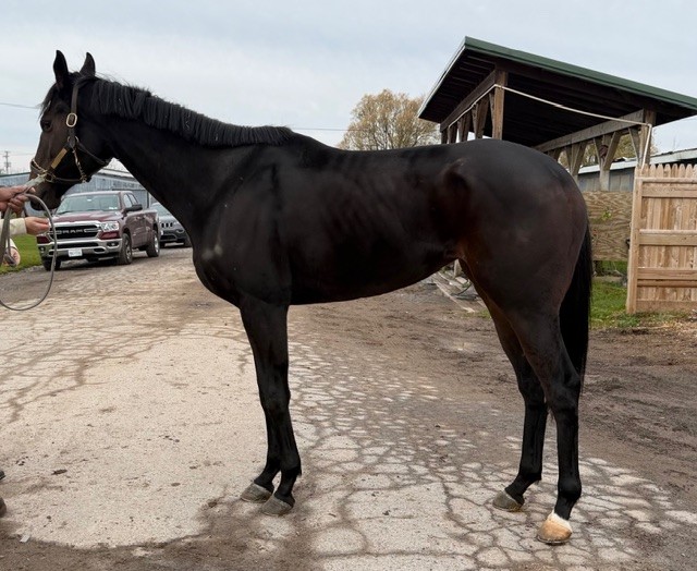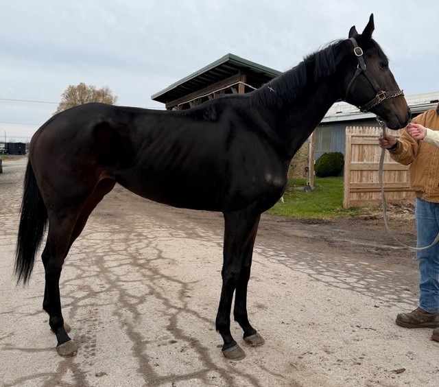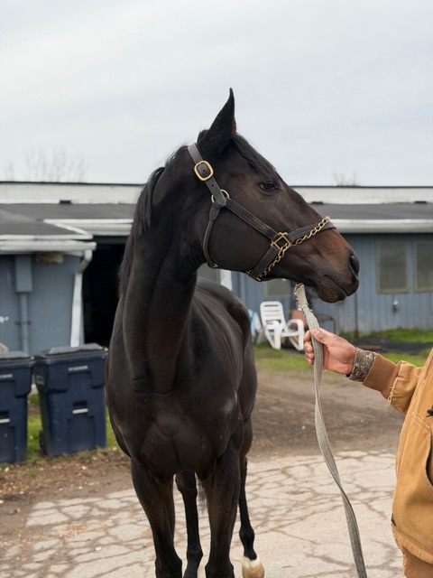 This sweet, pretty girl is a very refined and feminine filly. Her handler just kept telling us what a “nice horse” she is. And after meeting her, we totally agree. Even though it was a chilly and breezy morning, she was perfectly polite and ladylike for her photos and video. We’re told that she’s a “good girl in her stall” without any vices and that she’s also a good girl to ride. Overall, she was described as a generally very straight-forward filly. And that’s exactly what we observed- only three years old, she handled everything that she was asked to do like a pro!