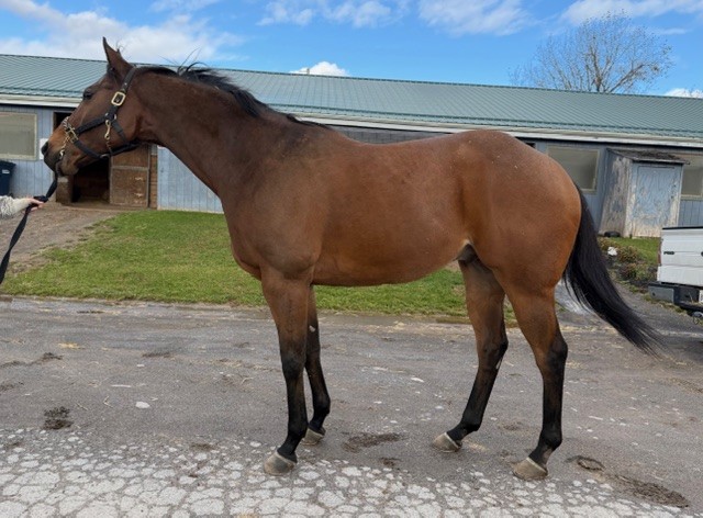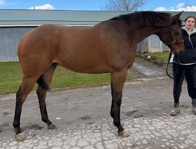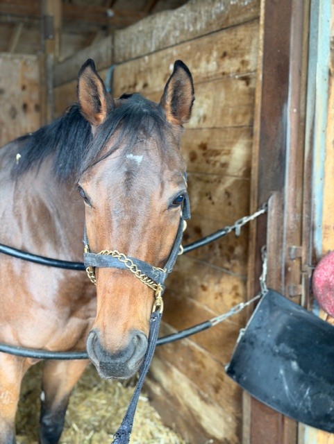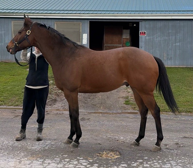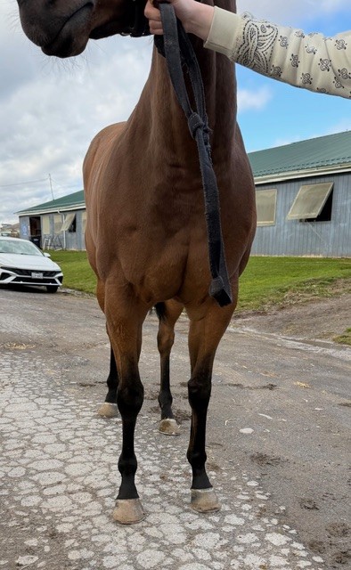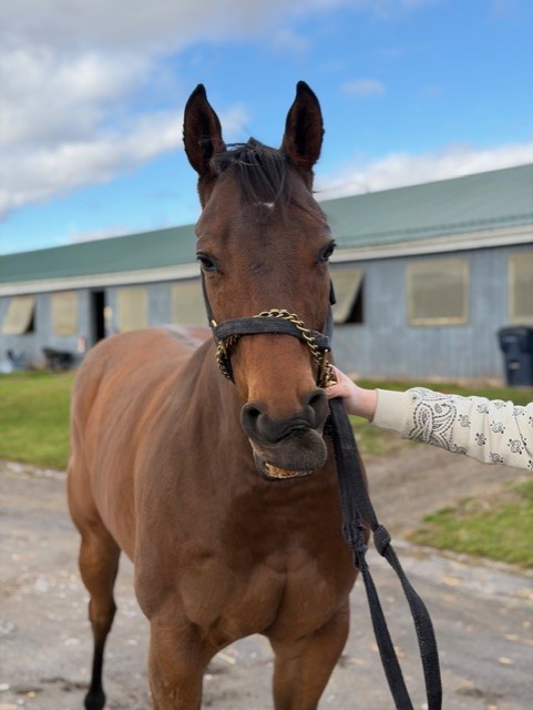What a hunk! When the trainer’s daughter brought this handsome solidly built guy out of the barn, we thought she was showing us a Quarterhorse track pony! Nope, he’s a TB, but he could fit right in at the QH shows. Son of Darkness is a durable sound war horse, a well known and popular horse around the Finger Lakes backside. While he could keep racing, he has not been as successful this year, so his connections, who have had him for several years, say he owes them nothing, but they owe him a great retirement to a new career. They describe him as an “old soul,” but with a young kid’s curiosity and love of life. They say he loves to stand and watch the goings on around him — when they take him to the track for morning exercise, they drop the reins, and he likes to stand there and watch for as long as you let him. But when you then say it’s time to get to work, he agreeably goes and does his job. Sounds like a horse who won’t be the least bit disturbed by the commotion in the schooling and warm up area at horse shows and events! They report that at the farm over the winter he is “like a puppy dog,” and is low man on the totem pole in his turnout group, He is reported to be sound, and he has shown his durability with 65 races spread out over his career, with an impressive 27 top three finishes, including 7 wins, and over $130,000 in earnings. He trotted along like a gentleman for his jog video, and showed very good movement, light and balanced. We were hardly surprised to see what a good mover he is, since the horses like him who have held up so sturdily over a long racing career tend to be light even and efficient movers who are not hard on themselves. Son of Darkness is by Justin Phillip, a son of First Samurai from the Giant’s Causeway sire line. His dam is from the Runaway Groom/Blushing Groom sire line.