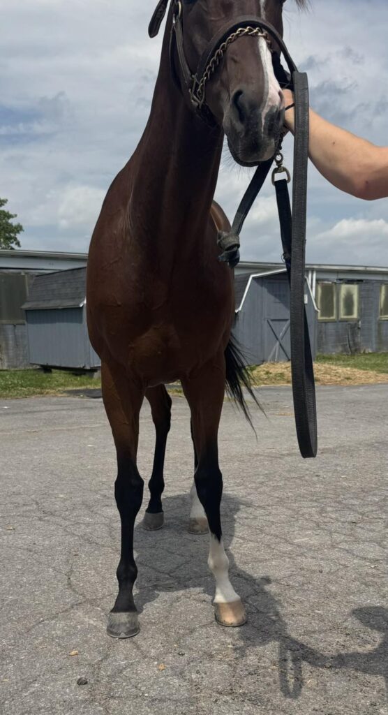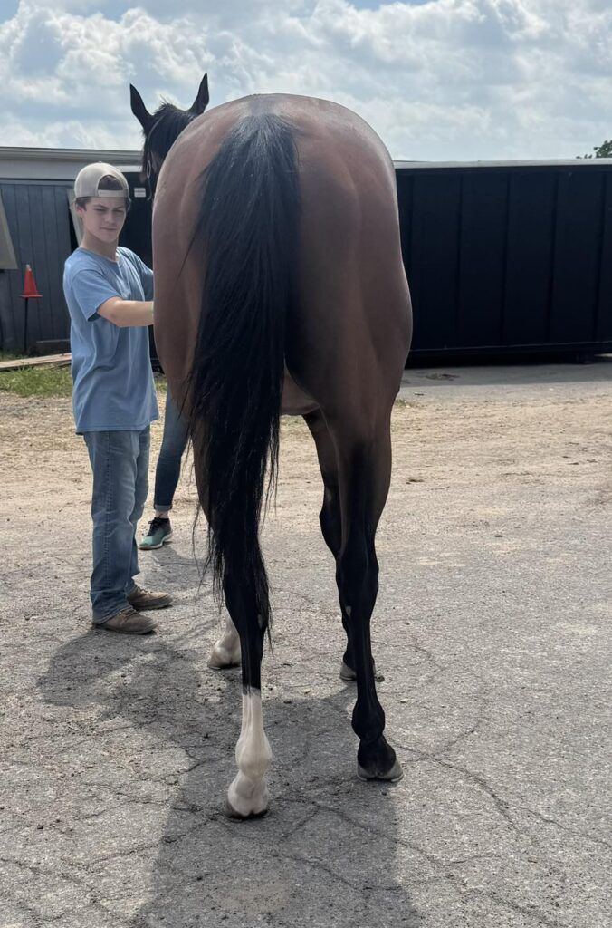 Take the Edge is reported to have no previous injuries and is to be sound. He’s a straightforward ride with no funny business. He was pretty excited to show our volunteers how adorable he is, so was a bit wiggly for his photo shoot. This guy is a must see in person as our photos do not do him justice! For his jog video, Take the Edge was very polite. He stayed with his handler as our volunteers directed him to slow down a bit. Take the Edge has natural suspension at the jog, with lots of swing and push from behind.