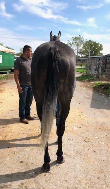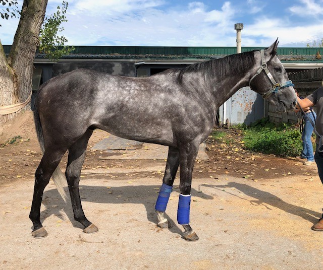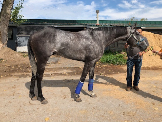 We have been long time fans of Cairo Prince offspring, as we have seen them year after year excel in many disciplines at the RRP TB Makeover, and in Take 2 hunter and jumper classes, and at dressage shows. People from various sport horse disciplines will tell you that if you can find a really nice Cairo Prince offspring, just go snap him up! Well, here he is!!! Utamaro represents everything that makes Cairo Prince offspring so sought after for sport horse disciplines: Beautiful., balanced, and dappled grey! Beautiful mover! Quiet and sensible, very friendly personality, willing and eager to pleae, with no vices. His groom said he is a mellow horse, good to handle and work with. Utamaro was very friendly for his photo session, happily taking the clover offered by someone who was helping us, posing like a star, and jogging on a loose lead while displaying lovely flowing and balanced movement — movement that shows why Cairo Prince offspring have been particularly successful in the show hunter ring and dressage arenas. Please note that this trainer’s barn wraps their horses immediately after their morning exercise, and by the time we got to his barn Utamaro was already wrapped — so the front wraps are standrad procedure. We spoke with his trainer, who told us that Utamaro is sound with no issues. While he has finished a good second and third in his two mosts recent starts, including this week, his trainer has a large stable and as the end of the racing season approaches he decides which horses are succeeding at the higher echelons of racing and thus will be overwintered for more racing next year, and which ones, while doing OK at the lower levels of racing, are great candidates for a new career. Utamaro obviously falls into this latter category, and what great opotential for a new sport horse career he has inded! Utamaro si by Cairo Prince, a son of Pioneer of the Nile. Utamaor’s dam, Mindy Gold, is out of the incomparable AP Indy, out of a daugher of Seeking the Gold and Classy Cathy, a multiple Grade 1 stakes winning daughter of Private Account. Cairo Prince, Pioneer of the Nile, AP Indy, Seeking the Gold, Private Account — all sires considered superstars in the sport horse world. We would love to see Utamaro be the latest FLF success story at the 2026 RRP — are you the lucky person who will bring out his potential and take yet another Cairo Prince offspring to the Finals?