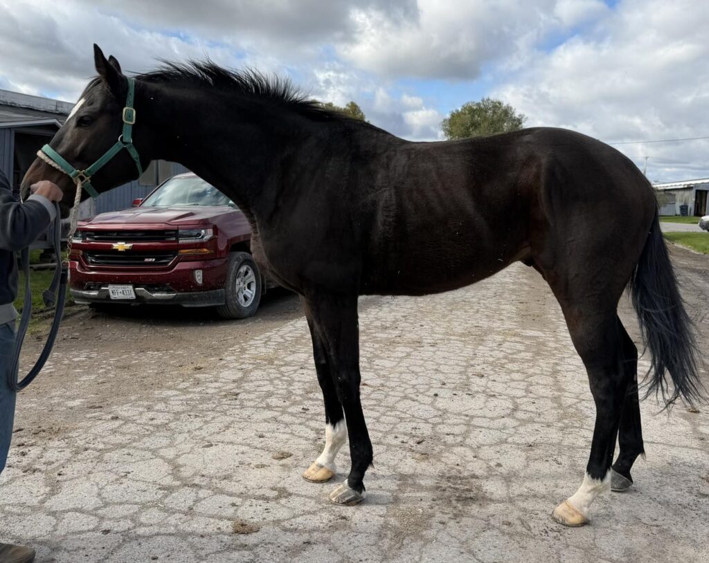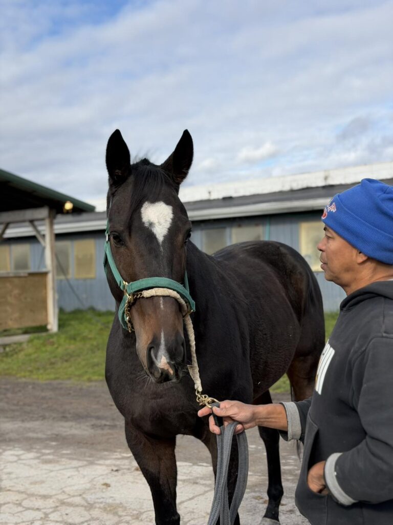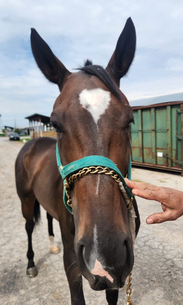 If you are looking for a TB in a Quarter Horse or warmblood thick body, this is your guy! And to add to the attractive package, he is a cute, kind, friendly peppermint hound! With Know Name has a thick massive chest and shoulder, solid bone, short cannon bones (which translates well to good movement and good jumping form), a compact balanced build, clean legs, and a beautiful heart in the middle of his forehead. His trainer kept saying “nice horse,” “good boy,” “happy boy”, and he attested that With Know Name is good to work with, has no vices, and he reports him as sound, and clean legged. He said he “must get a good home with lots of peppermints,” as With Know Name kept acting as adorable as he possibly could to beg — successfully — for us and for his trainer to dig up all the mints we could find in our pockets. He stood quietly and enjoyed our attention, and he was very polite for his jog video as he showed off an even relaxed gait on a loose lead. We can see this guy looking great in western tack, doing western dressage, or enjoying trails — but we also think he would look great in english tack as well, and his pedigree sure does offer sport horse potential. His sire Sharp Azteca is by Freud. Freud is Giant’s Causeway’s full brother, and equally as prolific a sire of kind good jumping horses who have excelled in eventing and in the show hunter ring and in the hunt field. His dam is by Sky Mesa, who is a son of Pulpit. With Know Name raced just a few days ago, in late September, and his trainer would love for him to find a new nonracing home with buckets of peppermints soon, because he says that is what this kind sweetheart deserves.
