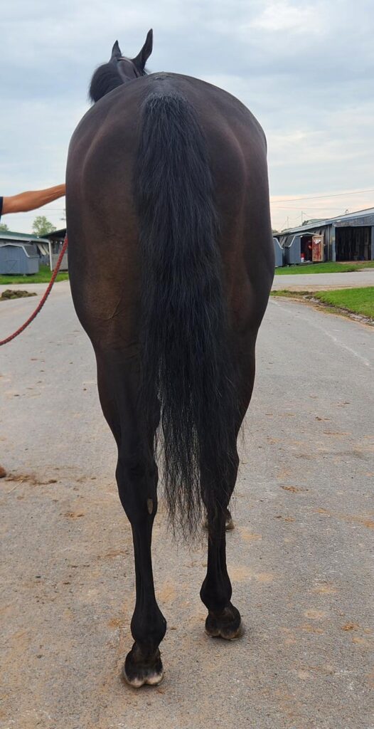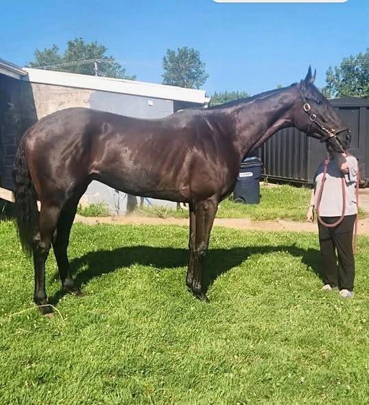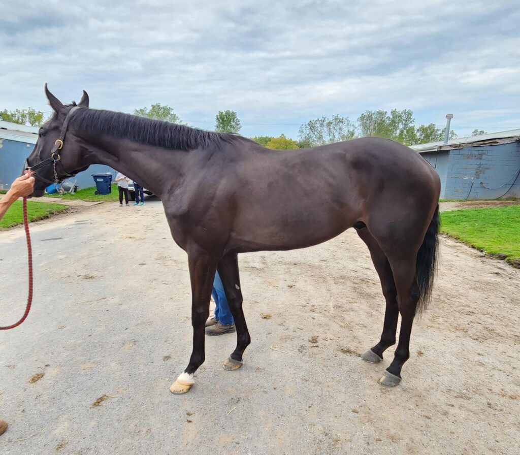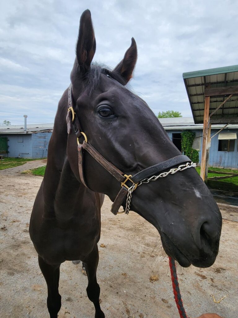 His connections jokingly called him “our little man” as he was being led out. But this very dark and handsome boy is one big, gorgeous, solid horse… with regal movie star good looks! Just a three-year-old with 7 lifetime starts (in which he’s failed to get on the boards); his trainer told us “he’s as sound as a dollar, but just doesn’t want to be a racehorse”. We were told that he’s meant to be a grass horse and doesn’t like racing on the hard dirt track at Finger Lakes. This “good boy” is said to be great in his stall, with no vices, loves attention from women (we can attest to that!), and that he is generally super sweet. As he has only been walking the past few days, his connections thought, being so young, he might be a bit more ‘up’ than usual. But he walked out quietly- that is until a very loud bang came from the shedrow right behind him (a horse walking in the shedrow must have double-barrel kicked the wall) loud enough that ALL of us jumped. And then there were repeated instances of loud, sudden noises (from both vehicles and horses) all around him during the early part of our session. This made him (understandably) tense and distracted during photos, but he respectfully held it together (we just weren’t sure that his final pictures would do him justice). We admired his regal profile, thick powerful build, and those ears! His ears are very unique ears with pointy tips curving inwards (reminding us of the Marwari breed). But perhaps what we loved most about him is that as one of our volunteers started giving him scritches on his withers, he noticeably exhaled and relaxed (which you might see in the photos) enough to do a nice jog video for us. And although he was still tense and tight, we thought he displayed glimpses of some lovely movement- lofty with suspension and good push from his powerful behind. A second jog video link with a rider, shot by his connections, is also included below. We’re told that his exercise rider loves him because he’s easy-going to ride, loves to gallop, and will go for hours. Certainly sounds like an event prospect to us! We think he might be one who will really flourish being able to rely on a sensitive and confident rider for direction, and then he will bravely charge into battle for you! Or, gallop around a cross-country course. A horse that we see as having U/L potential- all this and he’s a fairly lightly raced 3-year old.