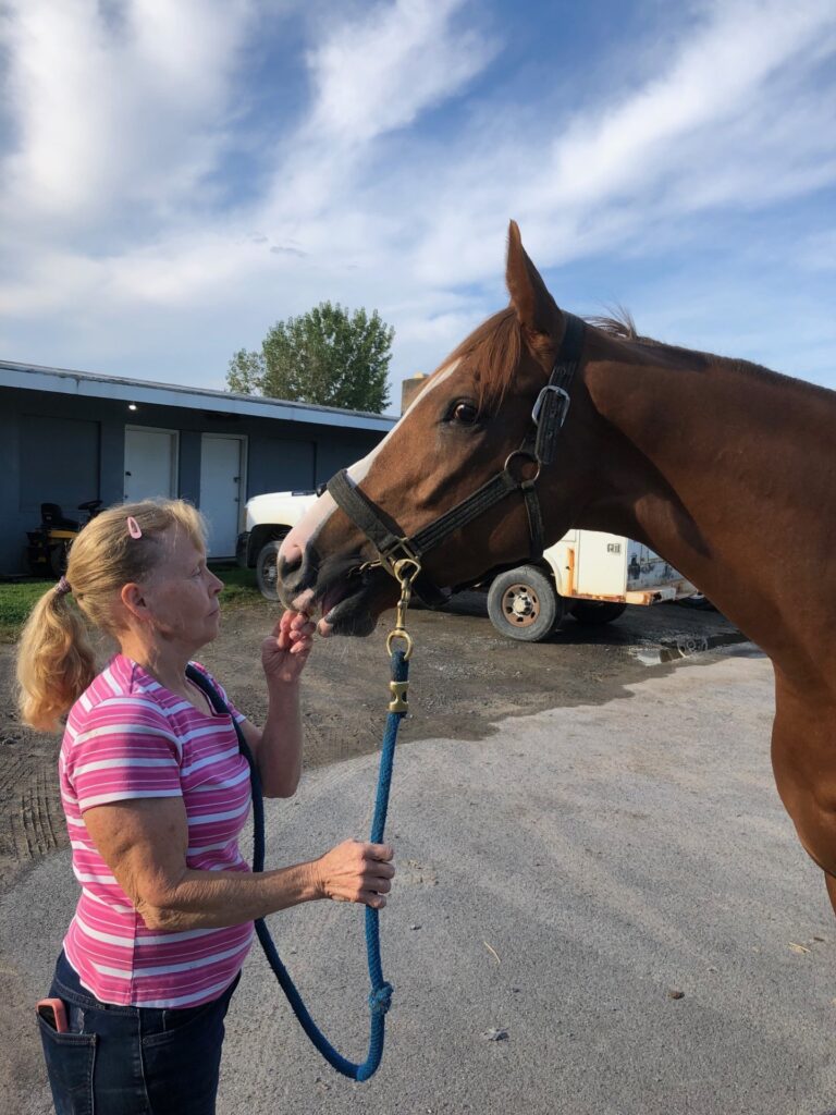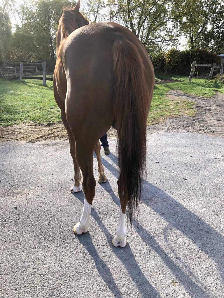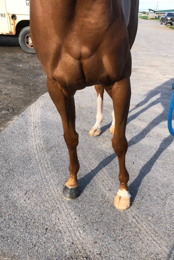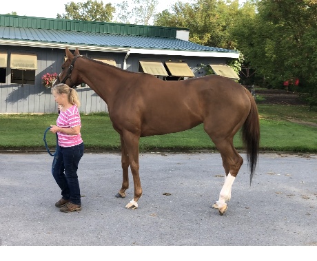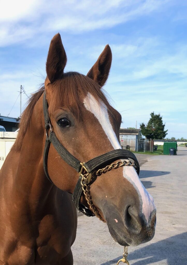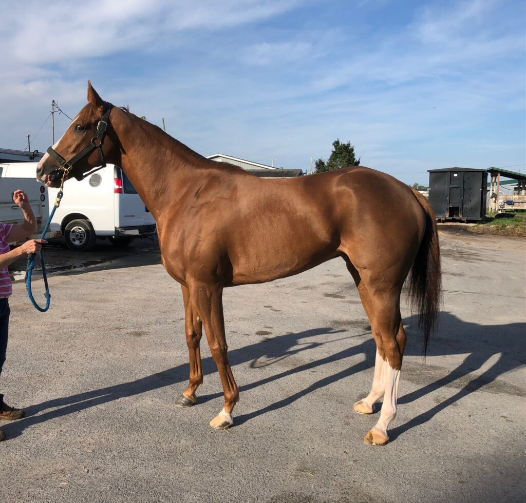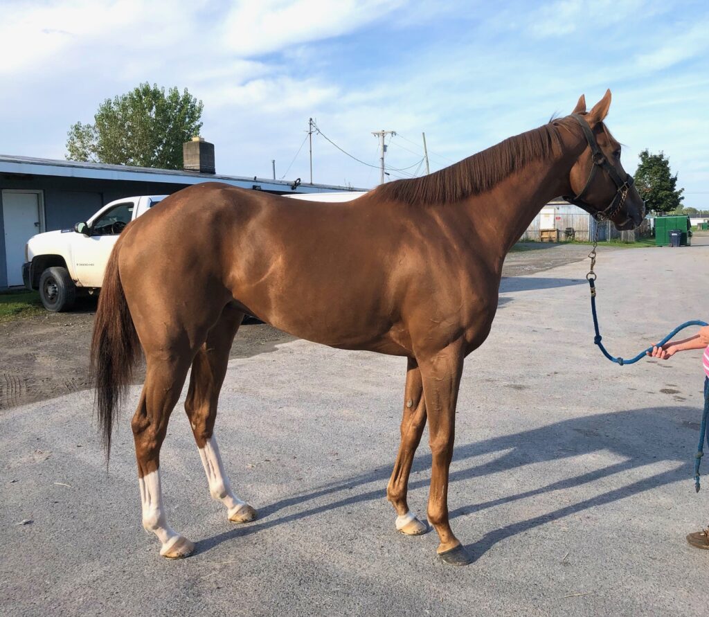 This very pretty and flashy filly with plenty of chrome is described by her trainer as a lovebug who snuggles with her three-year-old granddaughter. The trainer also reports that Artemis Girl is nice to ride and gallops in a snaffle, is totally sound, an easy keeper who is neat in her stall, and has no vices. She says that occasionally — such as when she hears the sounds of the afternoon races — Artemis Girl can get a bit amped up in her stall, but “other than that she’s not the stereotypical chestnut mare at all” — and over the winter turned out on a nearby harm she was laid back and easy to handle, This filly’s athletic uphill build suggests that she will be suited to a sport horse career, and her early racing success running long on the turf makes her an exciting prospect for eventing. While she has been trying hard and picking up some seconds and thirds on the hard dirt track at Finger Lakes, it is not what she is suited for — she wants that grassy cross country course! Artemis Girl has an excellent pedigree for sport horse disciplines — she is by Solomini, a son of Curlin, and her dam is by Malibu Moon, who is deservedly a highly popular sire in the eventing world. Her second dam is a multiple stakes winner by Pleasant Tap, another excellent sport horse sire.
