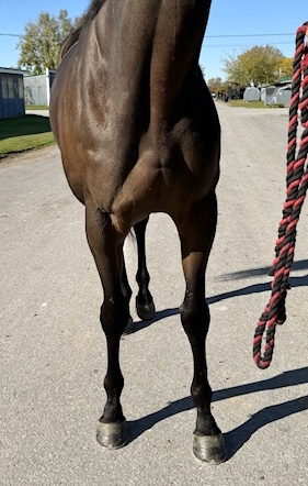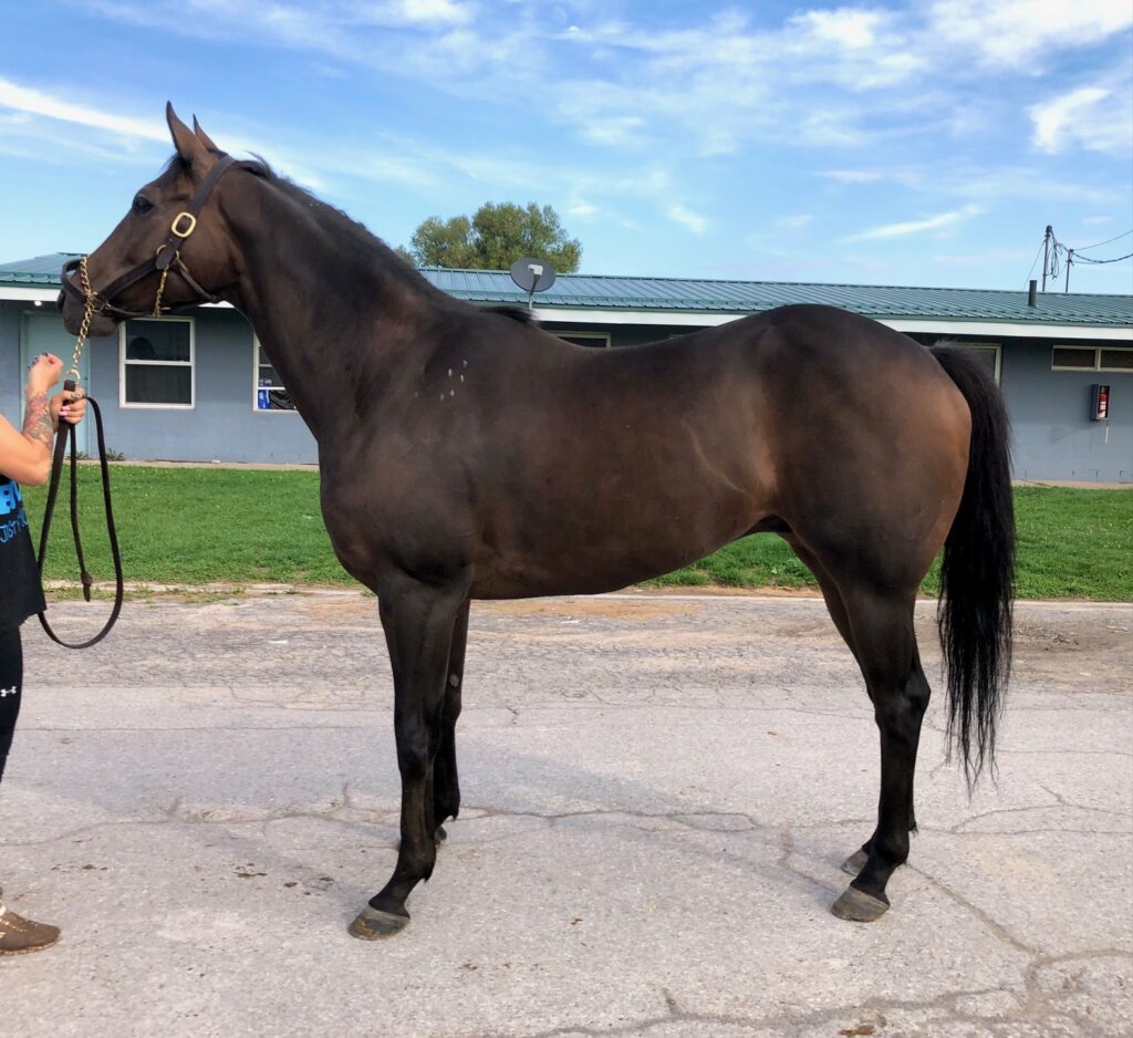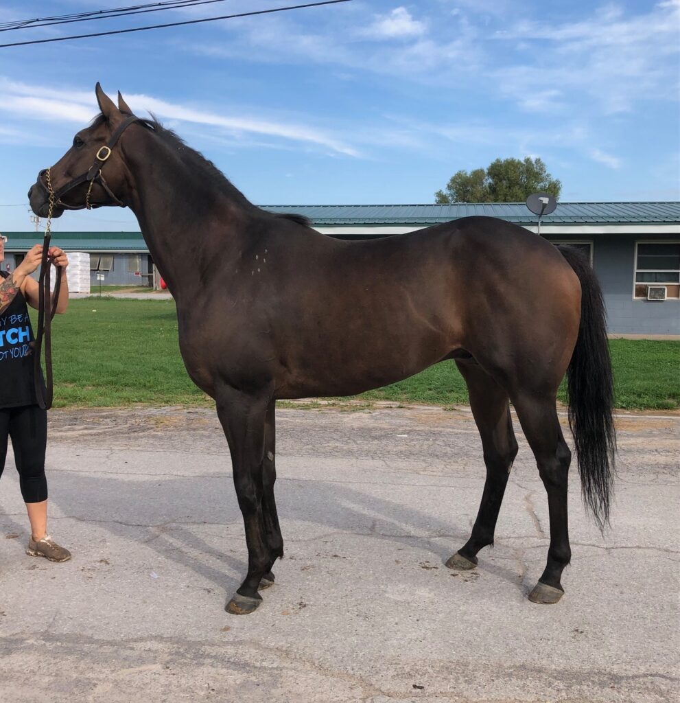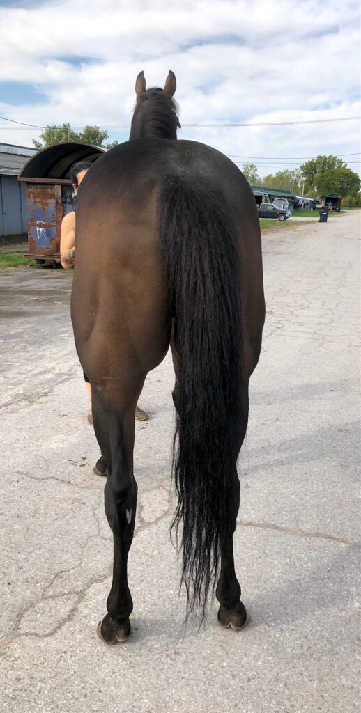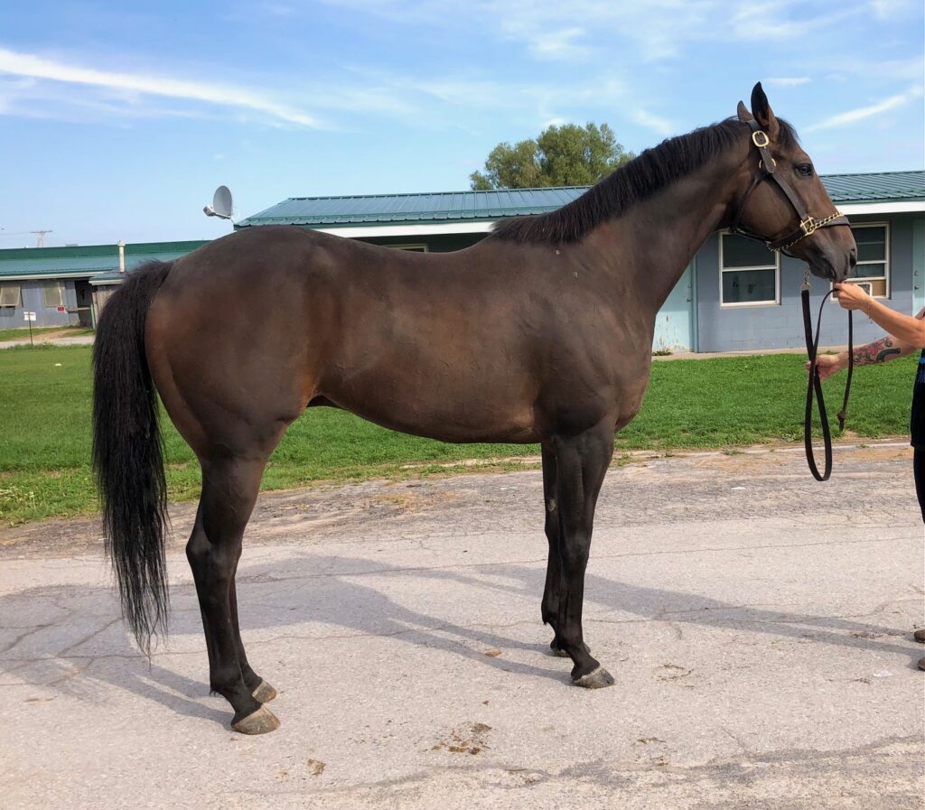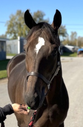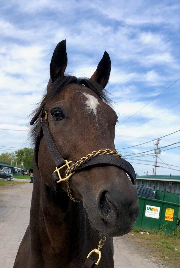 Brennan is a very handsome, solid bodied, sound and sensible guy who is a lovely light mover — and he has an outstanding sport horse pedigree. This is the whole package here! We listed Brennan last fall, but his trainer decided to keep him over the winter to bring him back to race this year on the synthetic track surface at Presque Isle, since Brennan had previously shown an affinity for the turf and synthetic tracks. Her decision was rewarded, as Brennan has a win, a second, and two thirds this year. But the Presque Isle race meet is ending soon, and Brennan does not care for the hard dirt track at Finger Lakes, so it is now time to let him move on to a new career. Recent research has shown that horses who prefer to run on turf and synthetic tracks make the best eventing horses. But with his solid good looks and light toe pointing movement, we can also see Brennan doing well in the show hunter ring. He can go in any disciplinary direction you want. His trainer reports that Brennan is a nice horse, easy to handle, no vices, sound, clean legged. He also has good feet. Indeed, he was barefoot for his photo session and jog video, since he had recently come back to his Finger Lakes base from racing on the synthetic at Presque Isle, and that track requires a different type of shoe, which she pulled as soon as he came back to her Finger Lakes barn. Brennan moved beautifully on hard pavement in his bare feet, light and springy with good engagement from behind and toe pointing reach — which we think is a testament to his soundness and good feet. He is by War Dancer, who is by War Front from the Danzig sire line. This is a turf running sire line that has produced many excellent eventers and jumpers. Brennan’s dam is by a son of Distorted Humor out of a Dynaformer mare — more excellent sport horse sire lines. Do not overlook Brennan this time around — this is a nice horse!
