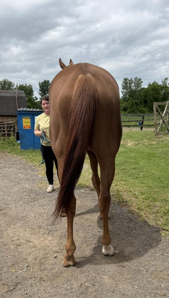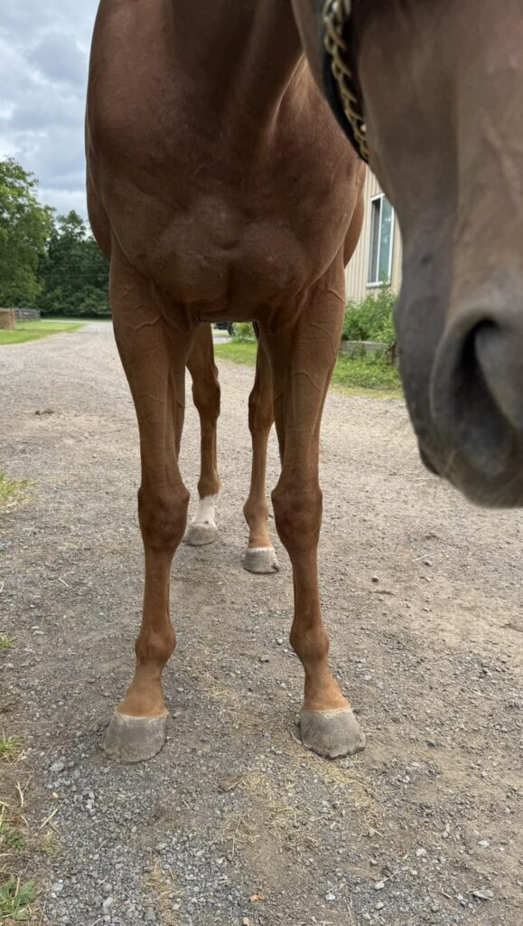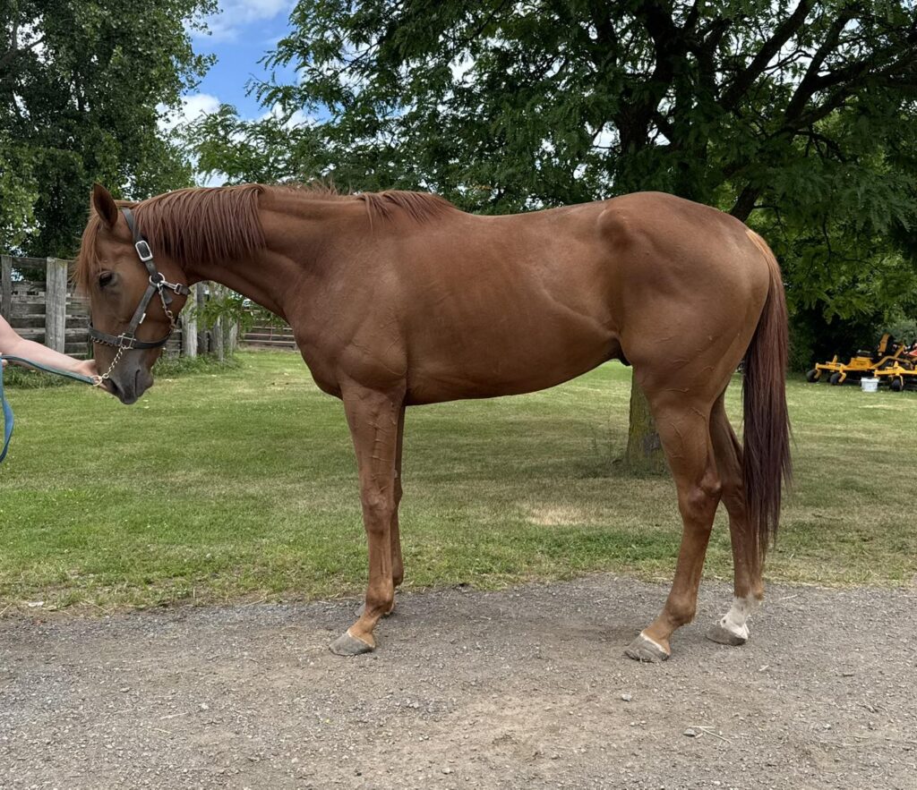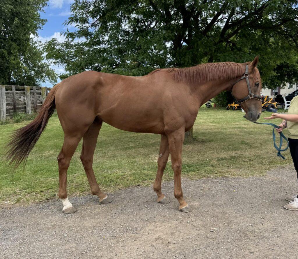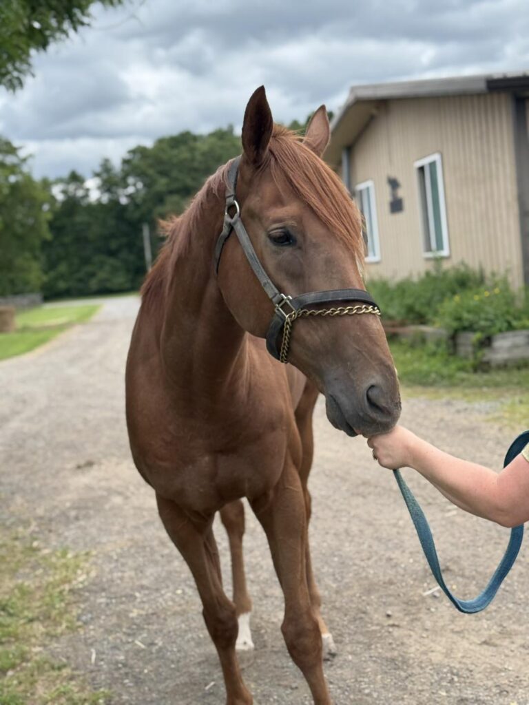 If you’re looking for a kind, sweet, tall drink of water, then look no farther than Fly by Night! This very handsome boy is truly enjoying his time away from the track. His trainer’s children lead him to and from his turnout. He hasn’t yet been with friends, but he is as happy and easy going as they come, so his connections have no reason to believe he won’t do great with friends. He is reported to have no vices and to be truly “excellent” to be around.