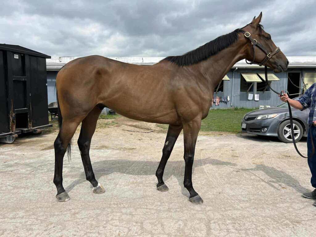 This big handsoem young son of the great Bernardini is described by his trainer as classy, great in his stall, easy to work on and around. He also reports that Indy Cowboy can be strong to gallop on the track,… but once he’s off the track and enjoying turnout he’s likely to mellow out as they all do. Indy has won three races, with three seconds in 19 starts, and his owners have decided to retire him from racing because he has a paralyzed flap (easily corrected with surgery). This affects horses’ breathing at racing or near racing speed, but at slower gallops — such as the pace of lower level eventing — it rarely presents problems. In addition to eventing success, Bernardini offspring have played well in the dressage sandbox, and dressage would be another good discipine for Indy. For his jog videos he showed off a light and lofty trot with a big flowing step, He is very well bred. His sire Bernardini is by AP Indy, and his dam is a black type producer by Smart Strike out of a Silver Deputy mare.