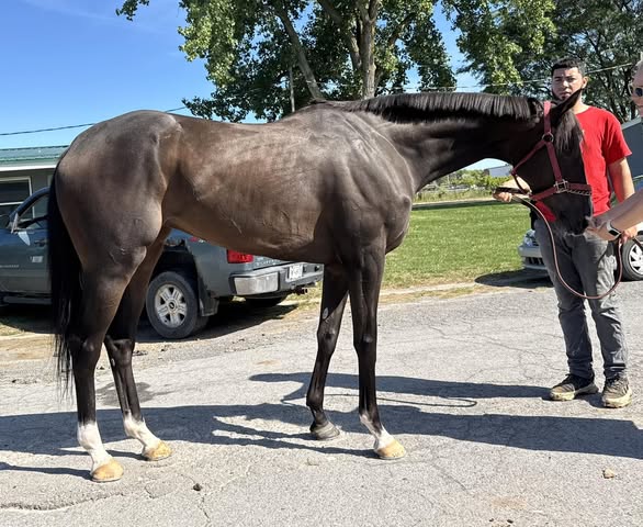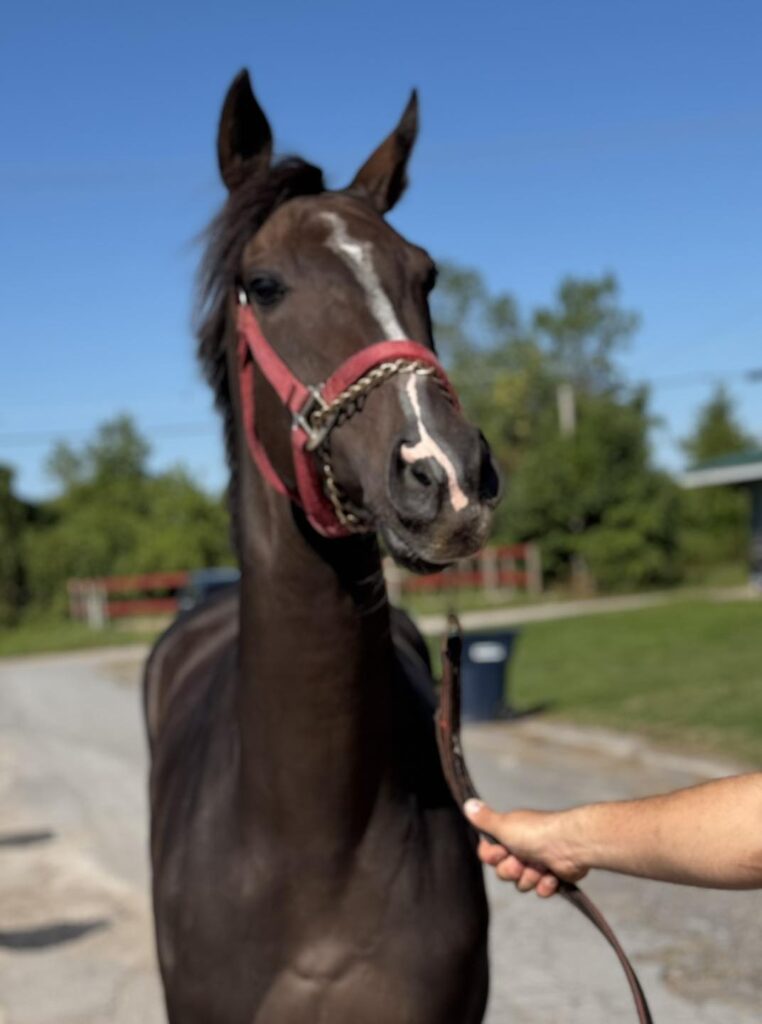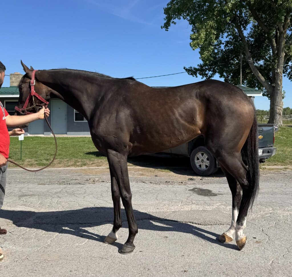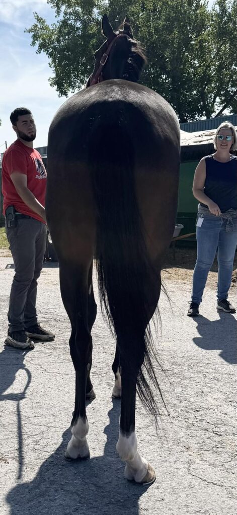 This lovely dappled girl is described by her connections as an “easy-going filly” who is a “sweetheart, not a runner” and a “doll that anyone at the track can ride”. That’s pretty much what we saw. She stood quietly as she was brought outside and her handler ran a brush over her pretty coat. We observed a sweet, relaxed, attentive, and ladylike mare. Her connections tell us that she doesn’t have any vices or injuries. But after a solid performance last year (including three wins), she has yet to get on the boards in her four starts in 2025; she just doesn’t seem have the same try. She is a striking and gorgeous girl, a dark bay color with just a touch of distinctive chrome. Slightly slenderer in build, leggy and elegant; she stood quietly remaining alert and expressive while we admired her pretty features. And although she was clearly happy to get moving, she remained attentive to her handler during her video, responding to his request to slow down on her second jog pass to display some pretty and springy movement. And we can vouch that she is fully peppermint trained! If you are looking for a sweet, pretty, affectionate mare then Jayla should be added to your list! Jayla is by Tourist (Tiznow) and out of a Giant’s Causeway mare. She has many notable sport sire lines appearing in her pedigree including Gone West, Hail to Reason / Halo, In Reality / Relaunch and Unbridled/ Fappiano.