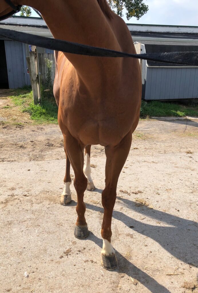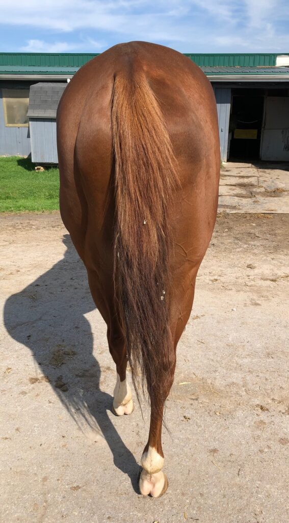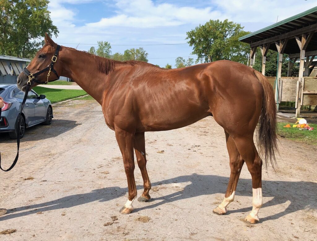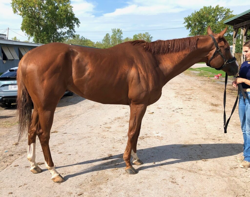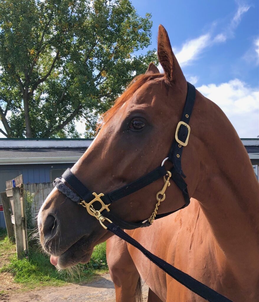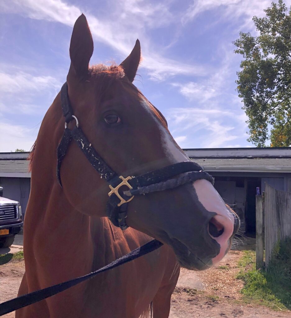 So why do we LOVE NY Riesling? Let us count the ways: He is a friendly people loving peppermint hound and eye candy in his own right with his flashy red coat and chrome. His groom and handler said he is the kindest horse to work with, always agreeable and never sets a hoof wrong. Everyone who rides him loves him — he is currently being exercised in the mornings by an apprentice jockey, and his trainer has also had other people who are learning to be exercise riders get on him because he is so kind and does whatever the rider wants. He has lovely balanced conformation, with a strong shoulder and powerful hind end, and he is clean legged and reported to be sound. We saw him only three days after he raced, and he showed very nice relaxed movement at the jog, flowing and with good reach. We think that when he is let down from racing he will be an even better mover! We were told that he has spent winters in between racing seasons on a farm where he turns out well in a group with other horses. And he is the sweetest kindest horse on the backside! After he politely begged us for more and more peppermints, the person who handled him for his photo session draped the lead rope over his neck and stepped away; as she started to walk, NY Riesling followed her like a puppy dog. Then she stopped — he stopped. Then she stepped left — he followed; she stepped right — he followed. She stepped back — he did the same. And then he followed her right back into the barn with the rope over his neck and no person leading him. Wow — imagine how fun ground work and bonding will be with this horse! She ponies horses during morning exercise and at the afternoon races, and she said “I could throw a western saddle on him and take him right out on trails or to ponying other horses.” And then our show hunter rider volunteer said “I could throw an English saddle on him and take him right into the show ring.” We agreed — Western, english, show, trails, hunter paces, junior riders, ammy riders (working with a trainer of course) — this horse could do it all. NY Riesling has a good race record, with 4 wins and an additional 8 top 3 finishes in his 29 starts. But this year he has not been running as well as in the past, so his trainer wants to let him go on to a new career and hopefully a home where he will be as beloved and pampered as he is with them. NY Riesling has an excellent pedigree for sport horse disciplines. He is by Redesdale, who is by Speightstown from the Gone West sire line — known for good jumpers. Redesdale’s stakes winning dam by Danzig is a full sister to Danehilll, a superstar sire of top European turf runners (and sport horses) — another indicator of eventing ability. NY Riesling’s dam is by AP Indy, out of a Seeking the Gold mare, and she is a granddaughter of the great sport horse sire Pleasant Colony (form His Majesty Robot lines) and from one of the best female families in the American TB stud book.