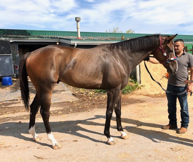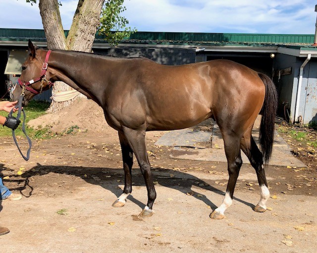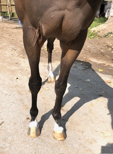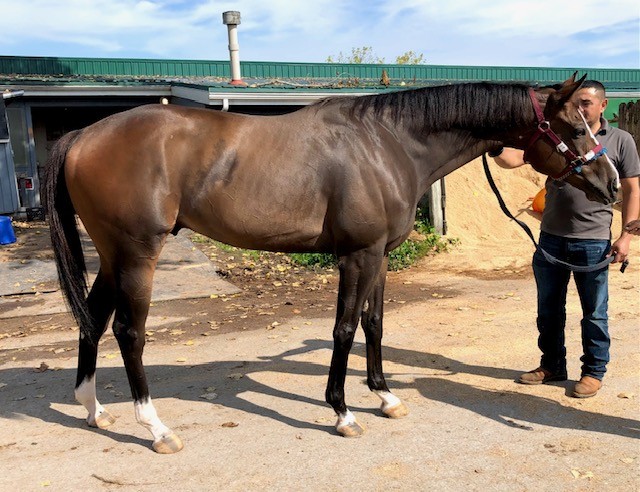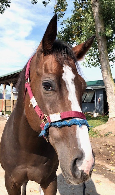 This handsome son of Maclean’s Music impressed us with his balanced conformation, strong shoulder, kind eye, and kind demeanor. He was always politely attentive to his handler, and his groom said he’s a good boy to handle and work with and has no vices. He has been a consistent and successful racehorse, with 4 wins, and 50% top 3 finishes in his 20 races. In mid-June, while training well for a return to the races after a winter break, he strained a front tendon. His trainer carefully rehabbed it, and it is cold and tight. Red Fortress has been trotting and cantering in the Eurociser and was cleared to go back into race training but with the end of the meet approaching his trainer thinks it is best to let him find a new career. The trainer did not think he has any limitations for a new career. With his solid build, kind temperament, and good looks, Red Fortress is an enticing prospect. Since he raced in 2024, and has published workouts in 2025, he is fully eligible for the 2026 RRP — we would love to see him add to the successes that FLFs have had at the RRP! He is sired by Maclean’s Music, a son of Distorted Humor. We have noted several Maclean’s Music offspring who have excelled in recent RRP TB Makeovers, as well as in hunter/jumper and eventing careers. His dam is by Yes Its True, from the Raja Baba branch of the Bold Ruler line — a durable old school TB line that those in the know seek out for sport horse careers. This lovely kind horse is being offered at a bargain price to help him find a good home soon.